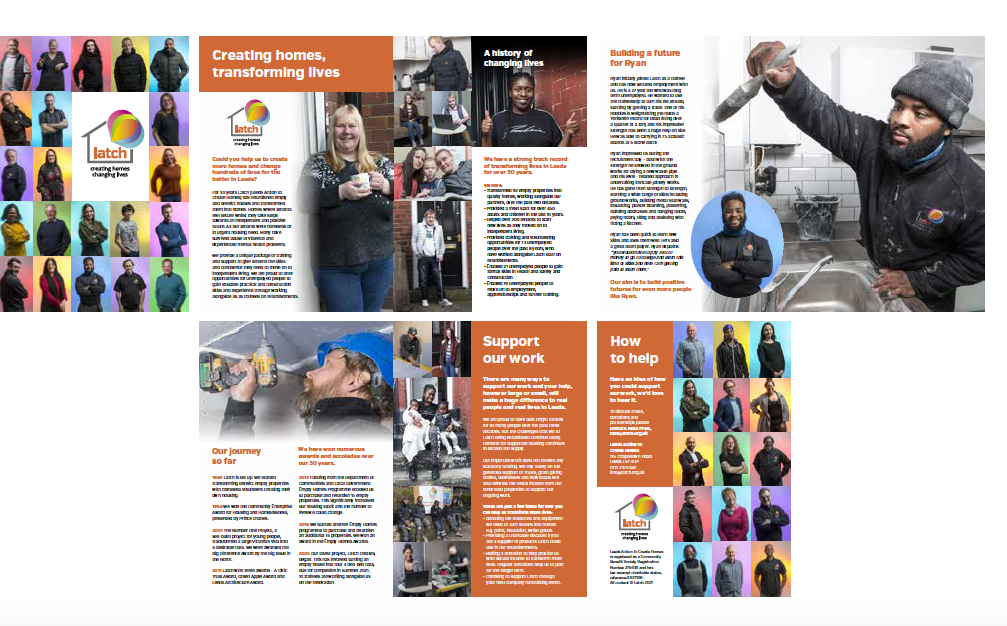 I provide ad-hoc ongoing marketing support for Leeds housing charity Latch. I was initially appointed to develop a marketing strategy and now work alongside them to write and design leaflets and other promotional materials, edit the website, develop their brand and social media guidelines and raise their profile in the media. I also write the Latch annual report each year. Please visit my PR portfolio to find out more about my PR work with Latch.